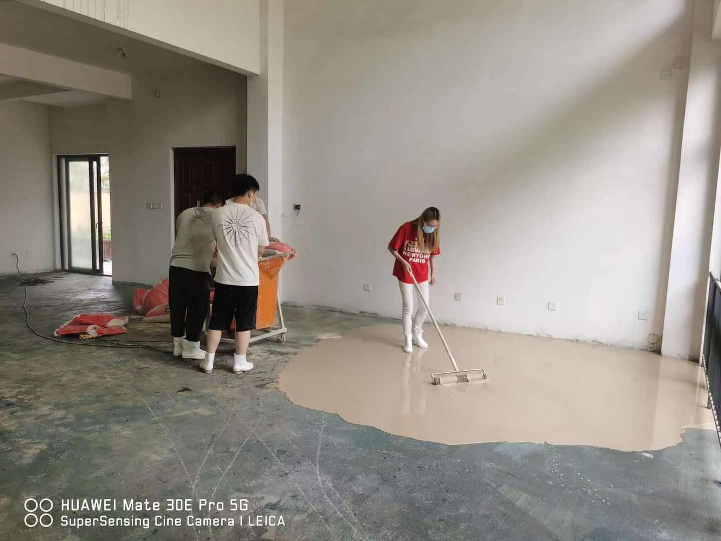 本次活動(dòng)地點(diǎn)為一棟5層樓的毛坯房,總面積約450㎡;顒(dòng)前期已將地面的沙塵和小石子清理干凈,并刷上一層界面劑,界面劑起到防水、封閉的作用,避免自流平流動(dòng)過(guò)程中失水過(guò)快,降低流動(dòng)性,或水分下滲形成氣泡針孔。