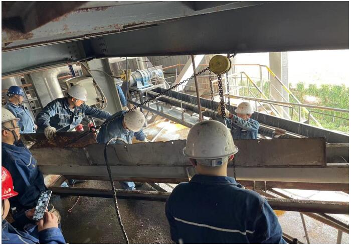 為更好解決后續(xù)物料輸送壓力,減少系統(tǒng)非計(jì)劃停機(jī),威遠(yuǎn)藍(lán)鼎生產(chǎn)部決定將兩條螺旋技改成輸送皮帶,10月30日,蒸發(fā)濃縮停機(jī)檢修,副總經(jīng)理黃安軍、副部長(zhǎng)楊平、宋雨鵬協(xié)同檢修班長(zhǎng)集中檢修骨干對(duì)氯化鈉螺旋進(jìn)行技改,31日13:30螺旋改輸送皮帶技改完成進(jìn)行試車(chē),11月2日帶料試車(chē)正常,經(jīng)過(guò)一周使用觀察,本次技改相比螺旋故障率更低,物料輸送更松散、均勻,也大大改善了干燥前端下料堵塞等問(wèn)題,同時(shí)也得到了釩廠運(yùn)行車(chē)間的認(rèn)可和生產(chǎn)員工一致好評(píng),體現(xiàn)了公司敢于創(chuàng)新、技改的精神。