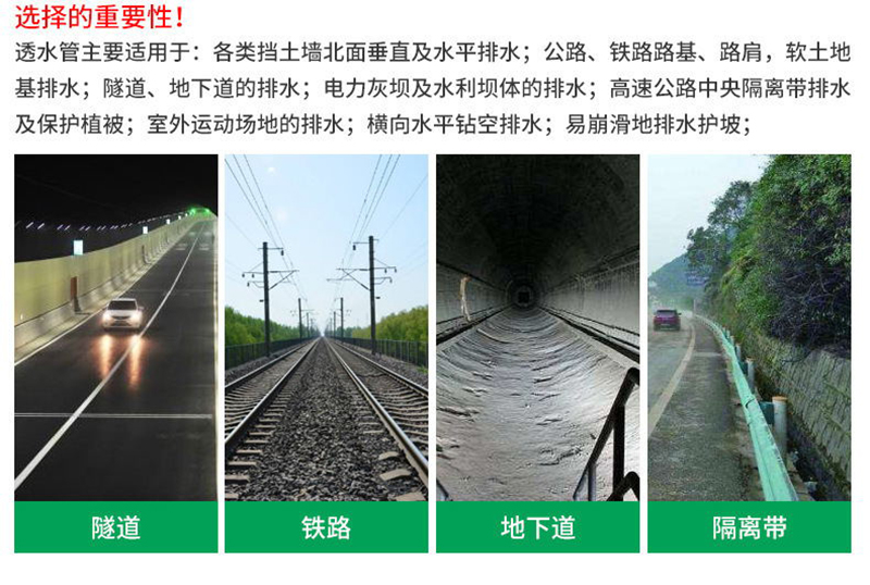 軟式透水管主要適用于:1)各類擋土墻背面垂直及水平排水;2)公路、鐵路路基、路肩,軟土地基排水;3)隧道、地下道的排水;4)電力灰壩及水利壩體的排水;5)高速公路中央隔離帶排水及保護植被;6)室外運動場地的排水;7)橫向水平鉆空排水;8)易崩滑地排水護坡;9)屋頂花園及花臺排水;10)山坡地水上保持11)整地工程的地下排水;12)低洼地排水及鹽堿地改造系統(tǒng)。